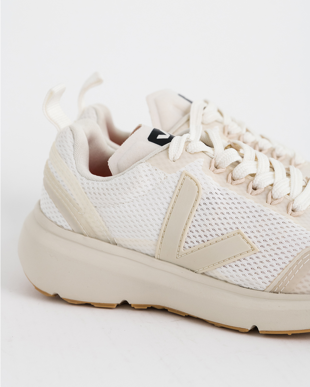 VEJA Condor 2 Alveomesh white pierre. The Condor was born in 2019 as the first running shoe after the oil era. The sneaker therefore contains many oil details. For example, the V logo is made of castor oil and banana oil is incorporated into the sole. Veja strives to work as sustainably as possible. The upper is made of alveomesh that is 100% recycled from plastic bottles. The upper stands on a sole of "wild rubber" from the Amazon region.