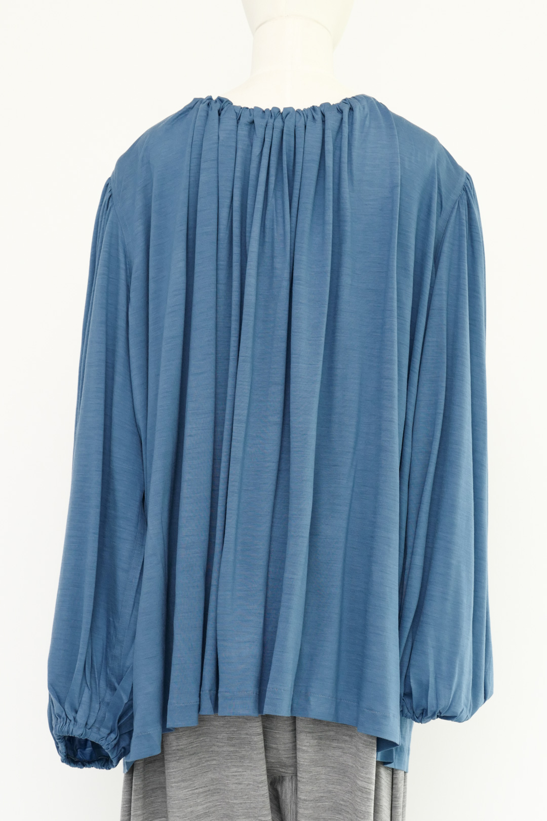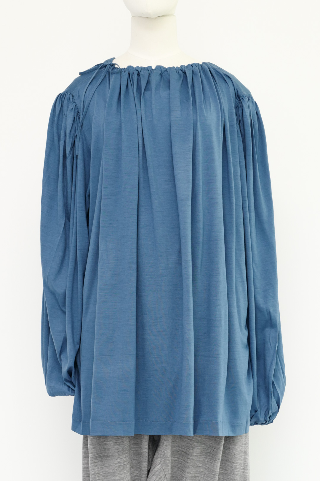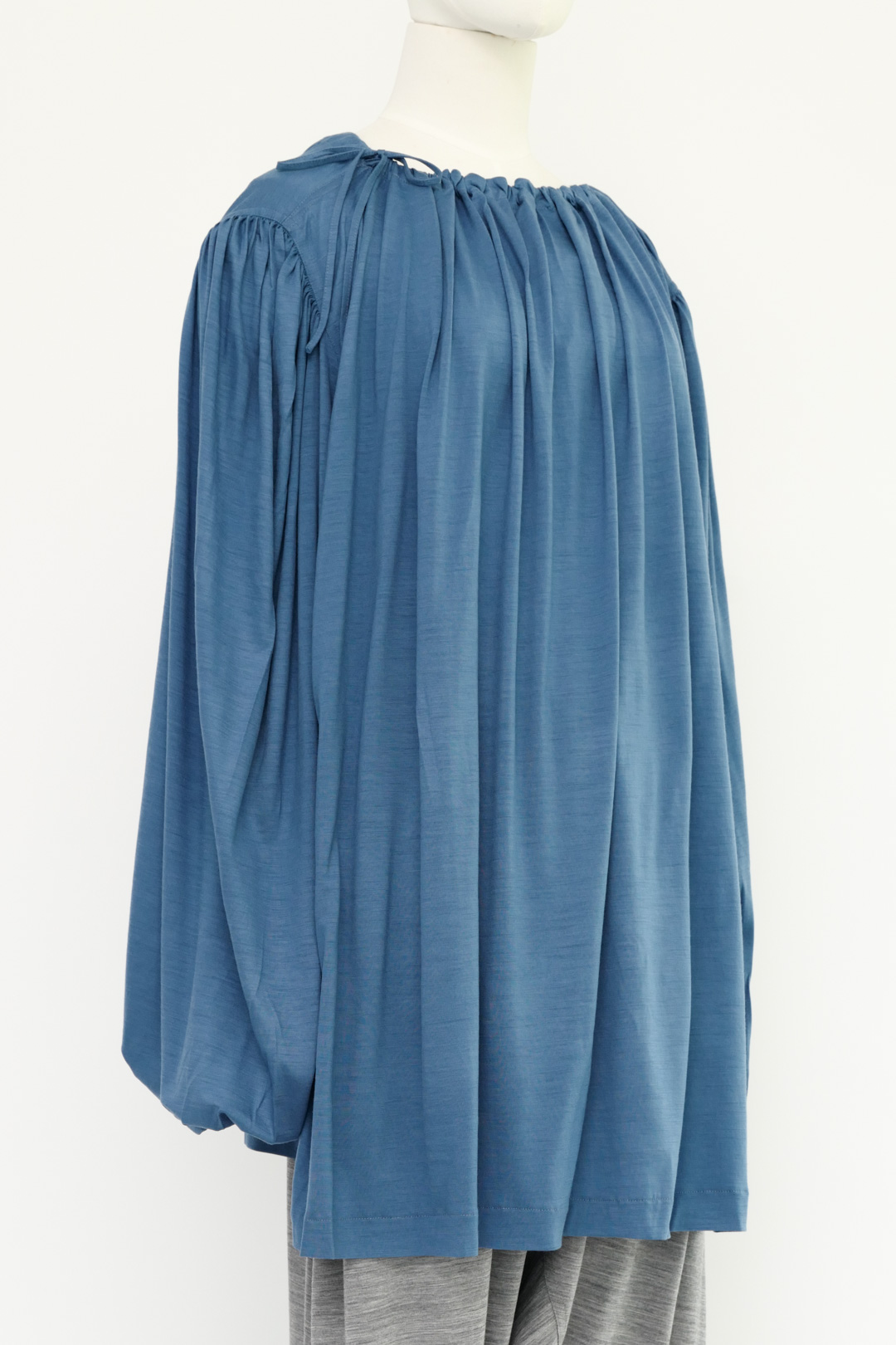 Gathered-neckline knitted top from SOFIE D'HOORE featuring sky blue, virgin wool, gathered neckline, long wide sleeves and straight hem.