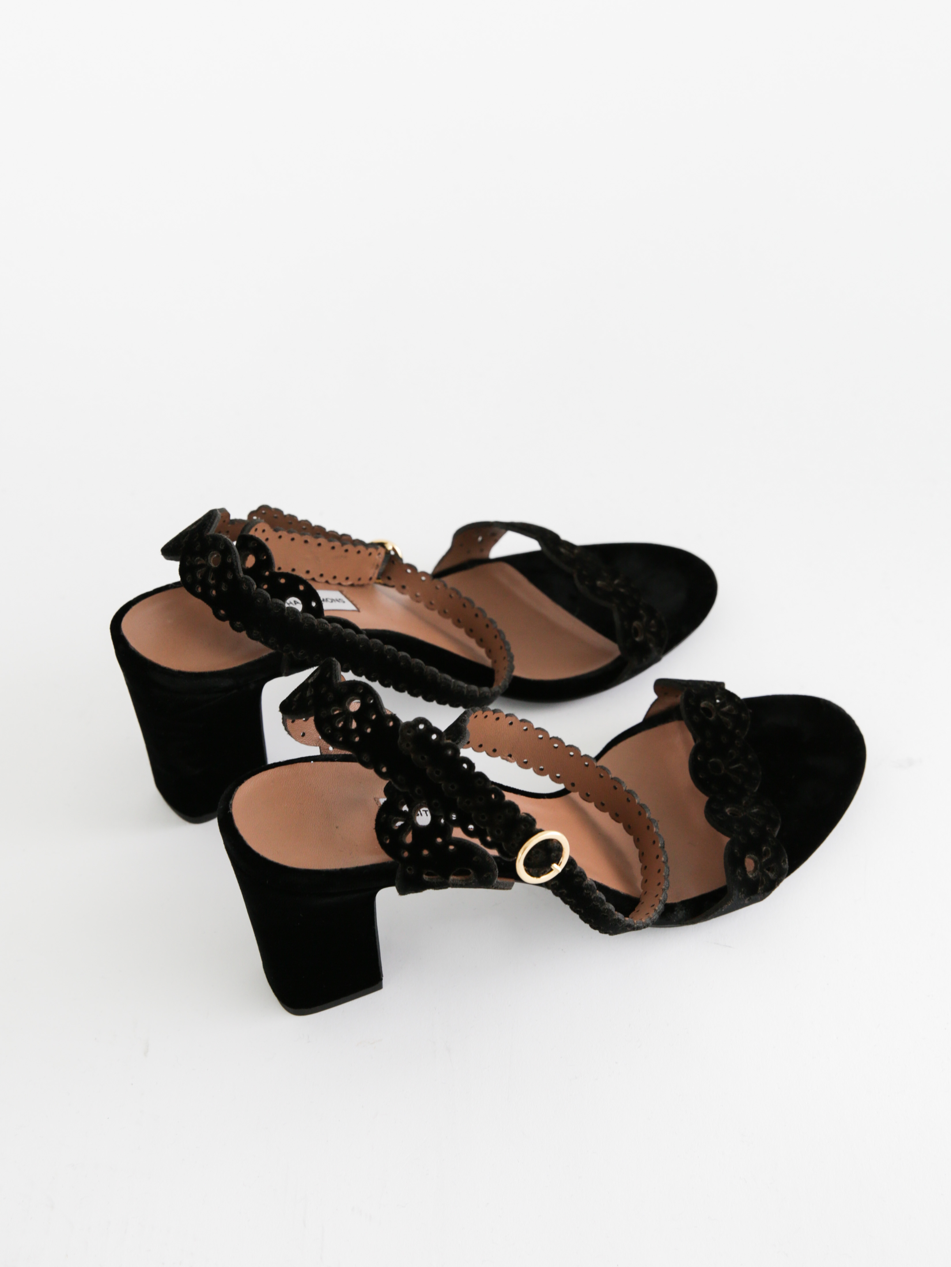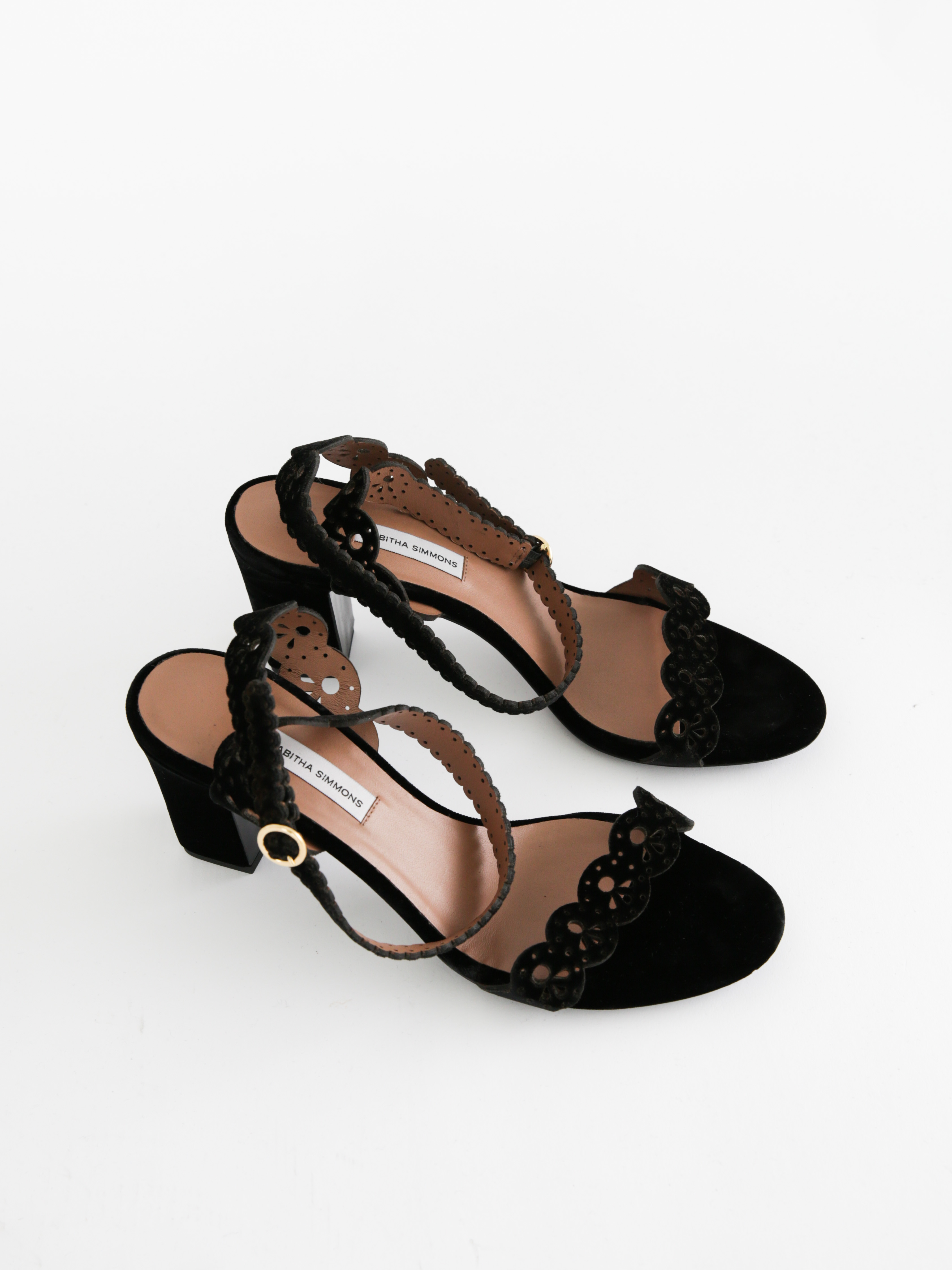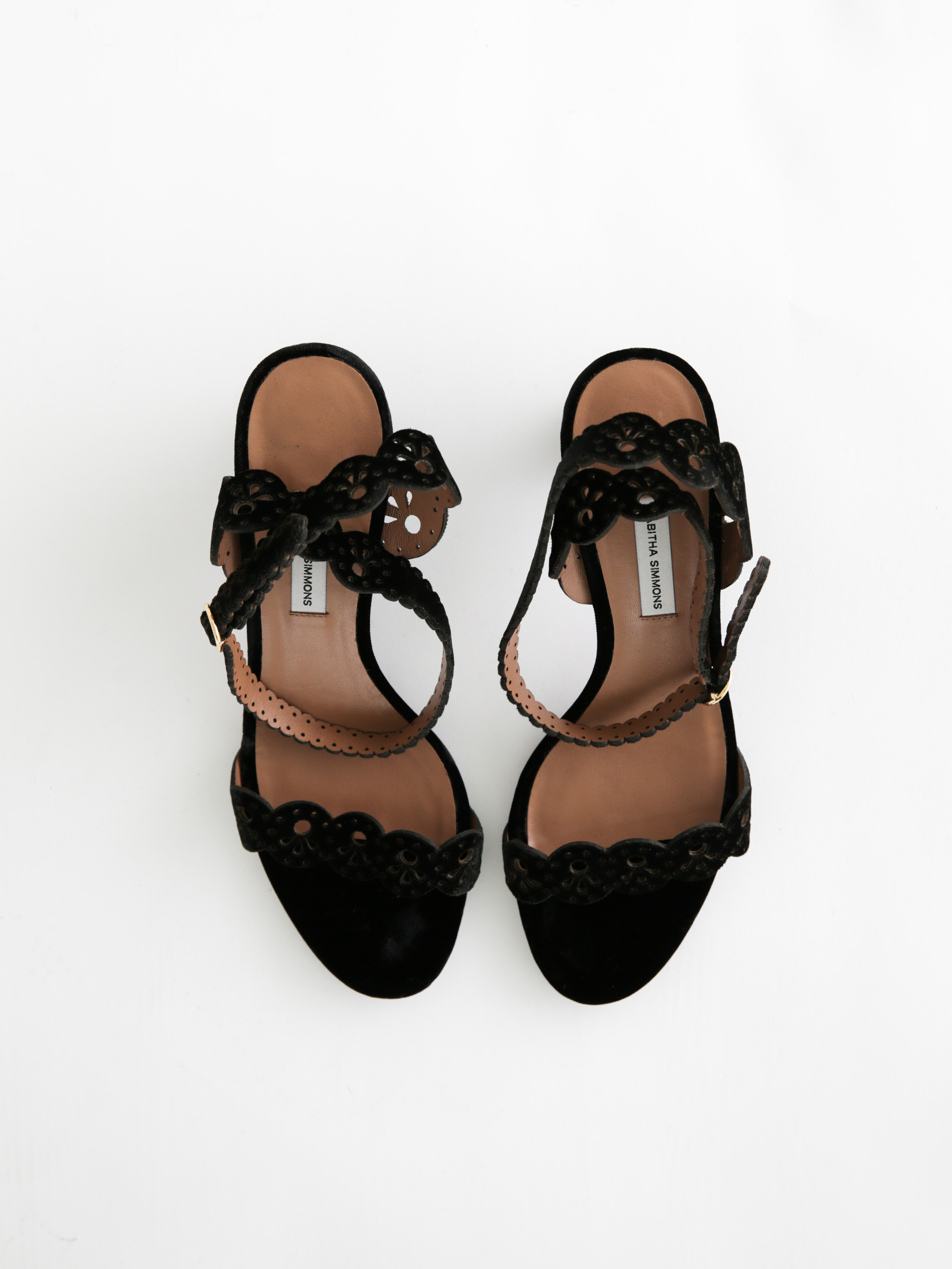Slip into the fun of the laser cut suede Tabitha Simmons Bobbin Block sandals. With ankle strap and adjustable buckle closure, open-toe silhouette, leather lining