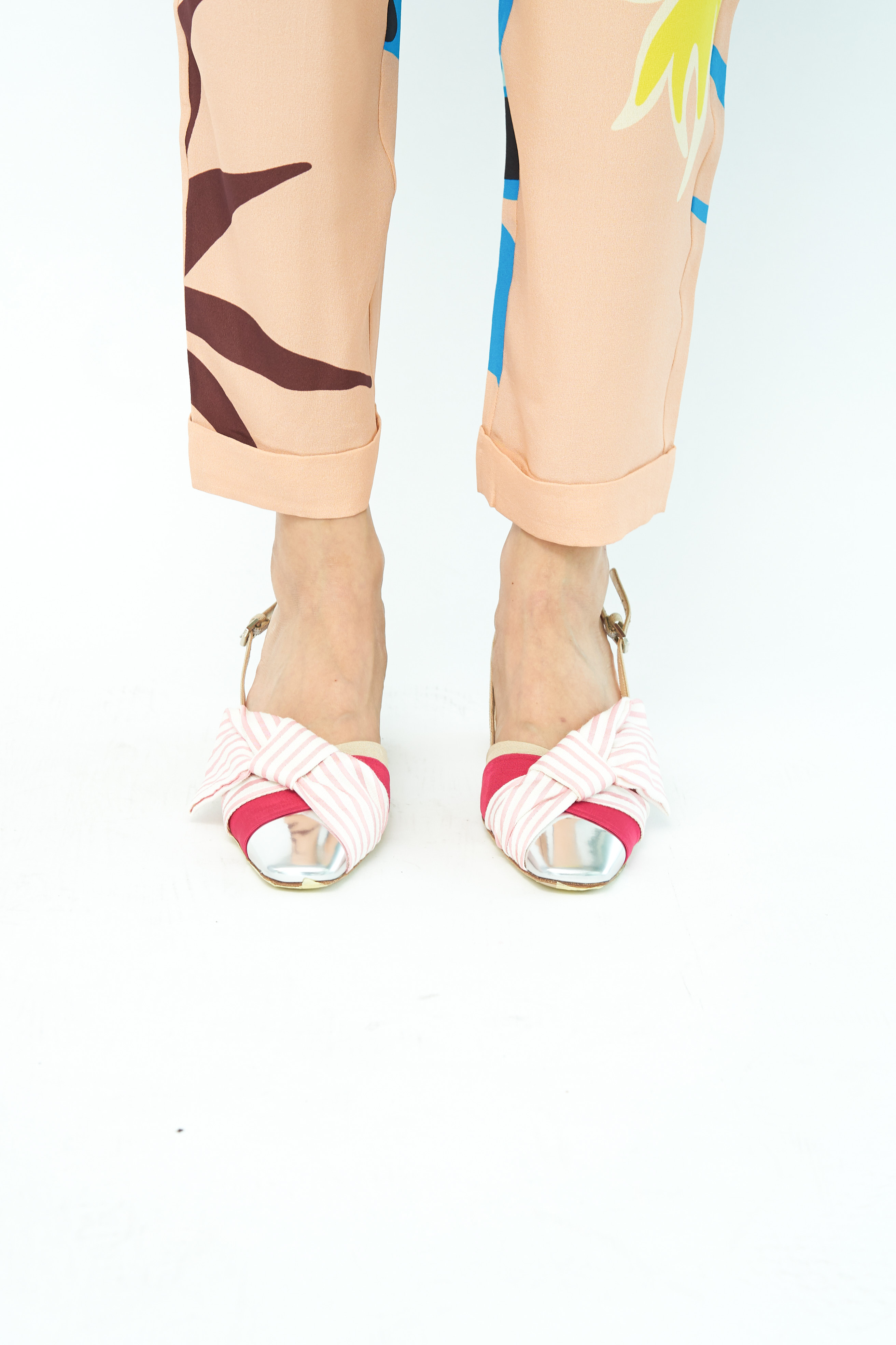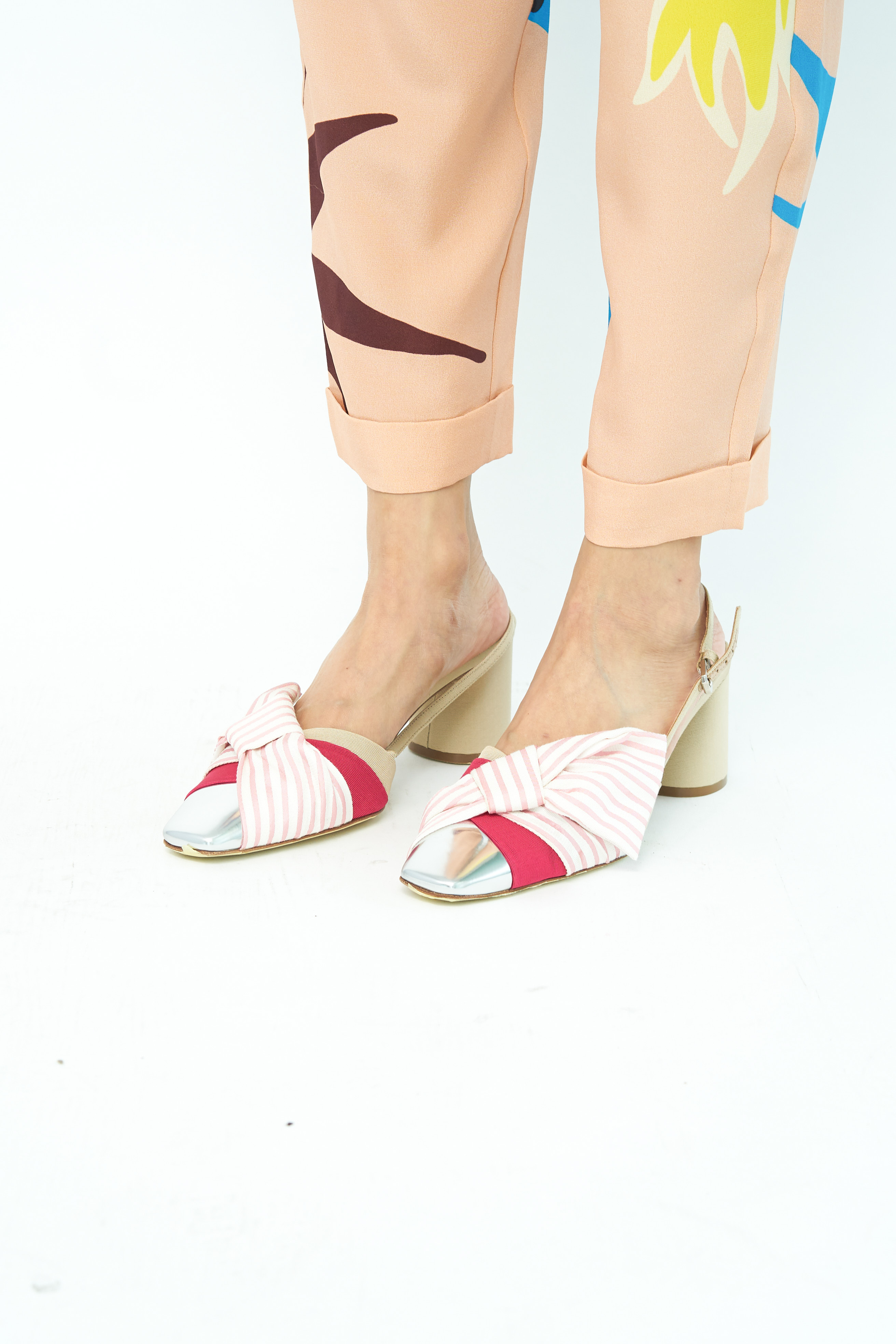Nappa leather with varnished effects shoes. Fabric bow appliqué, solid color, narrow toeline with leather lining and leather sole.