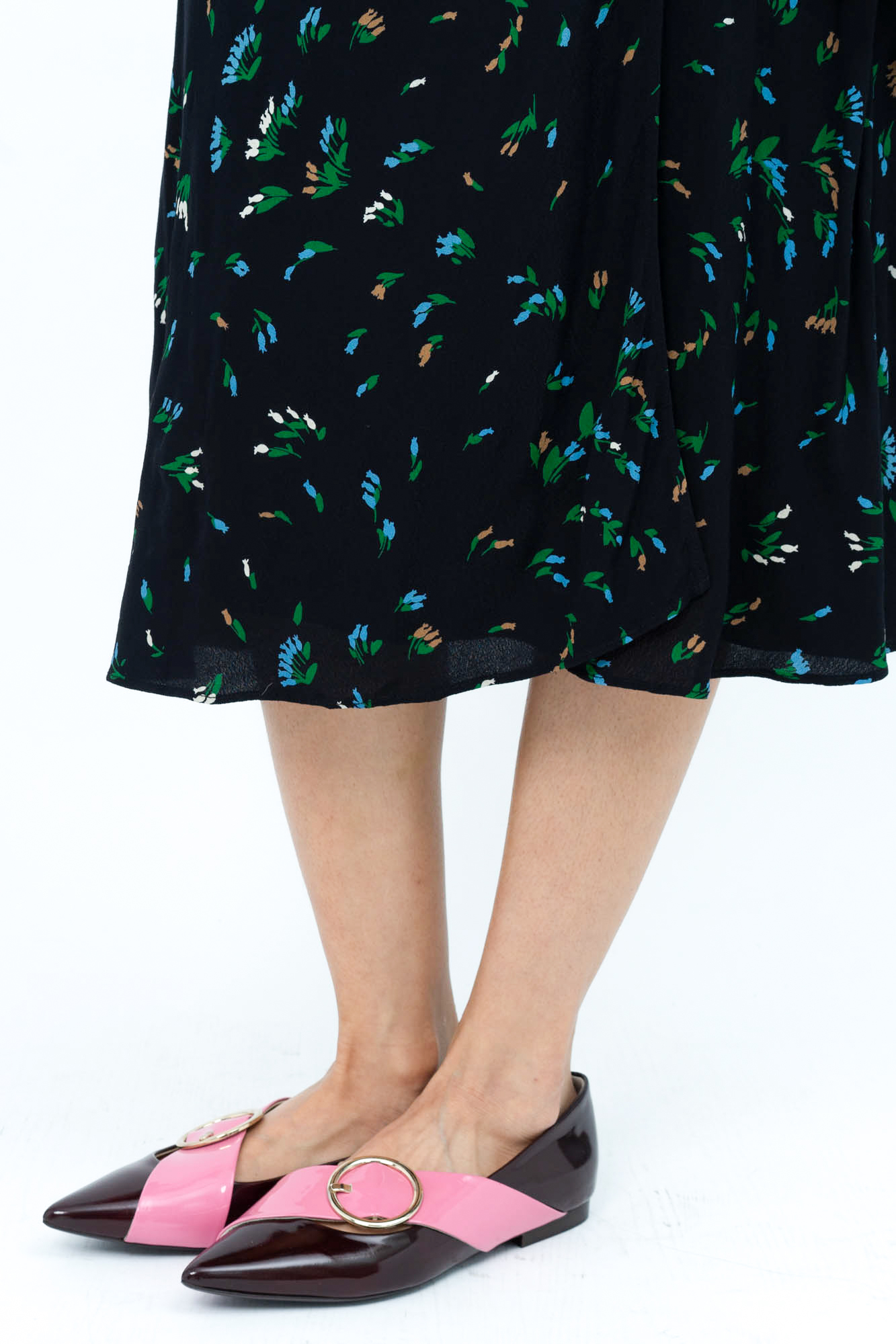 Nappa leather, varnished effect, folds, two-tone, narrow toeline, flat, leather lining and leather sole.