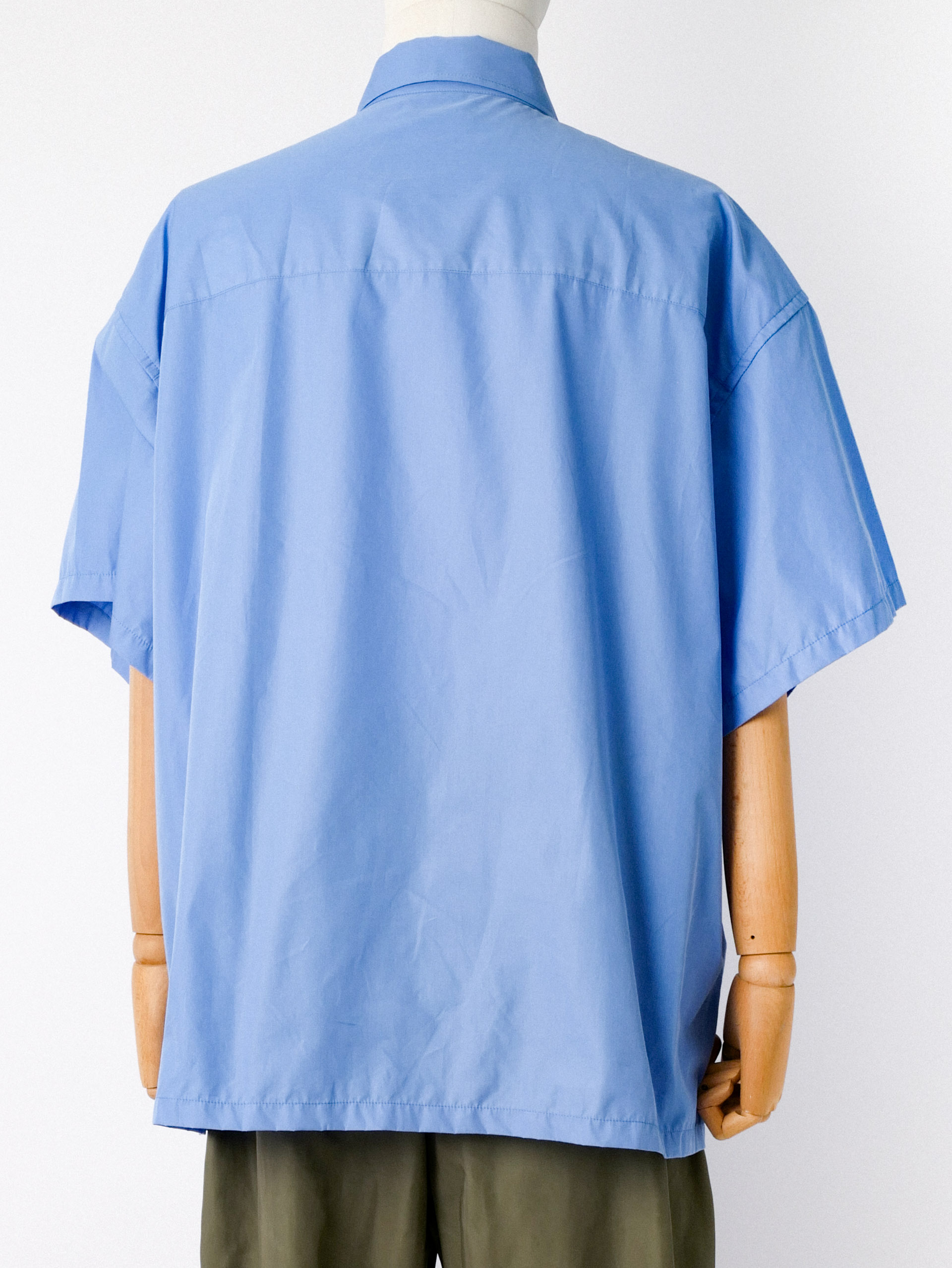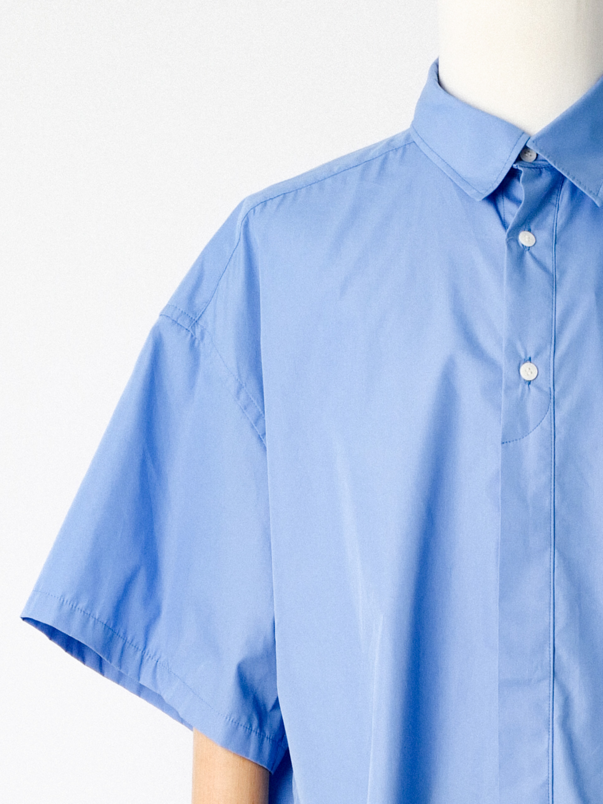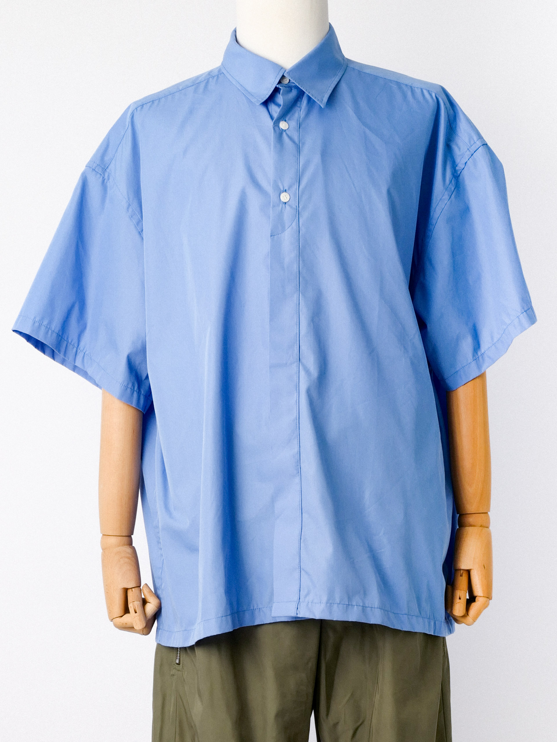 This modified fly-front shirt in blue from IS-NESS creating a simple yet playful design