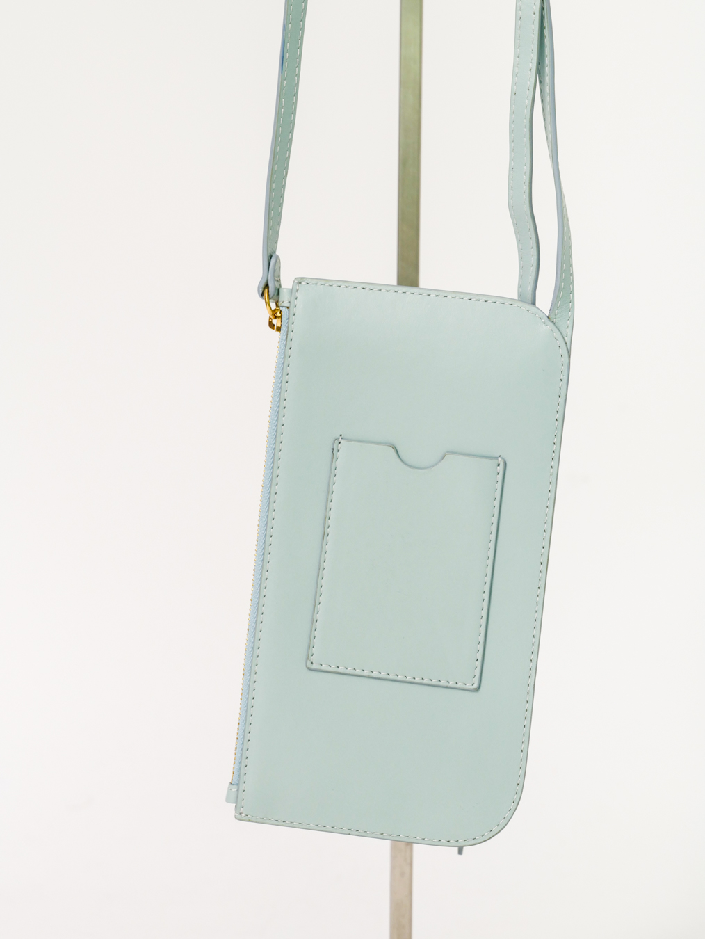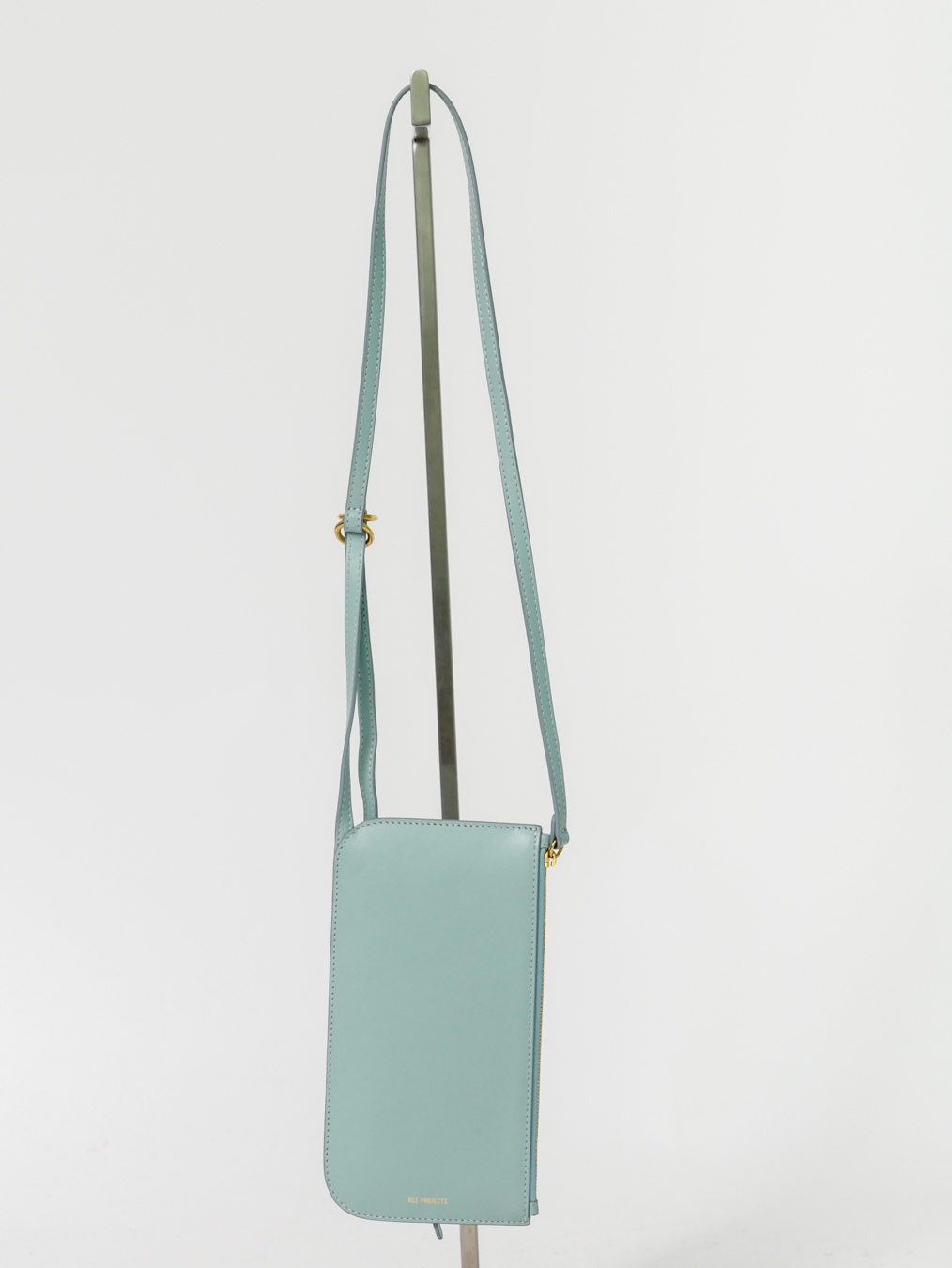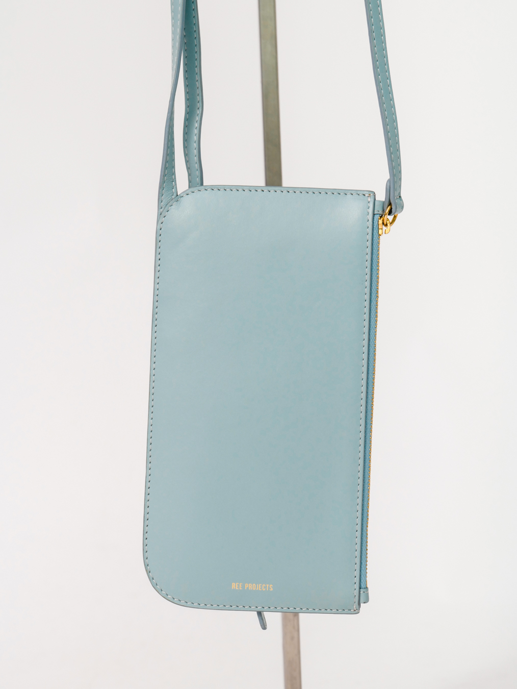 Baby blue calf leather Do neck-pouch bag from REE PROJECTS featuring gold-tone logo lettering, side zip fastening, adjustable neck strap, rear card slots and internal logo stamp.