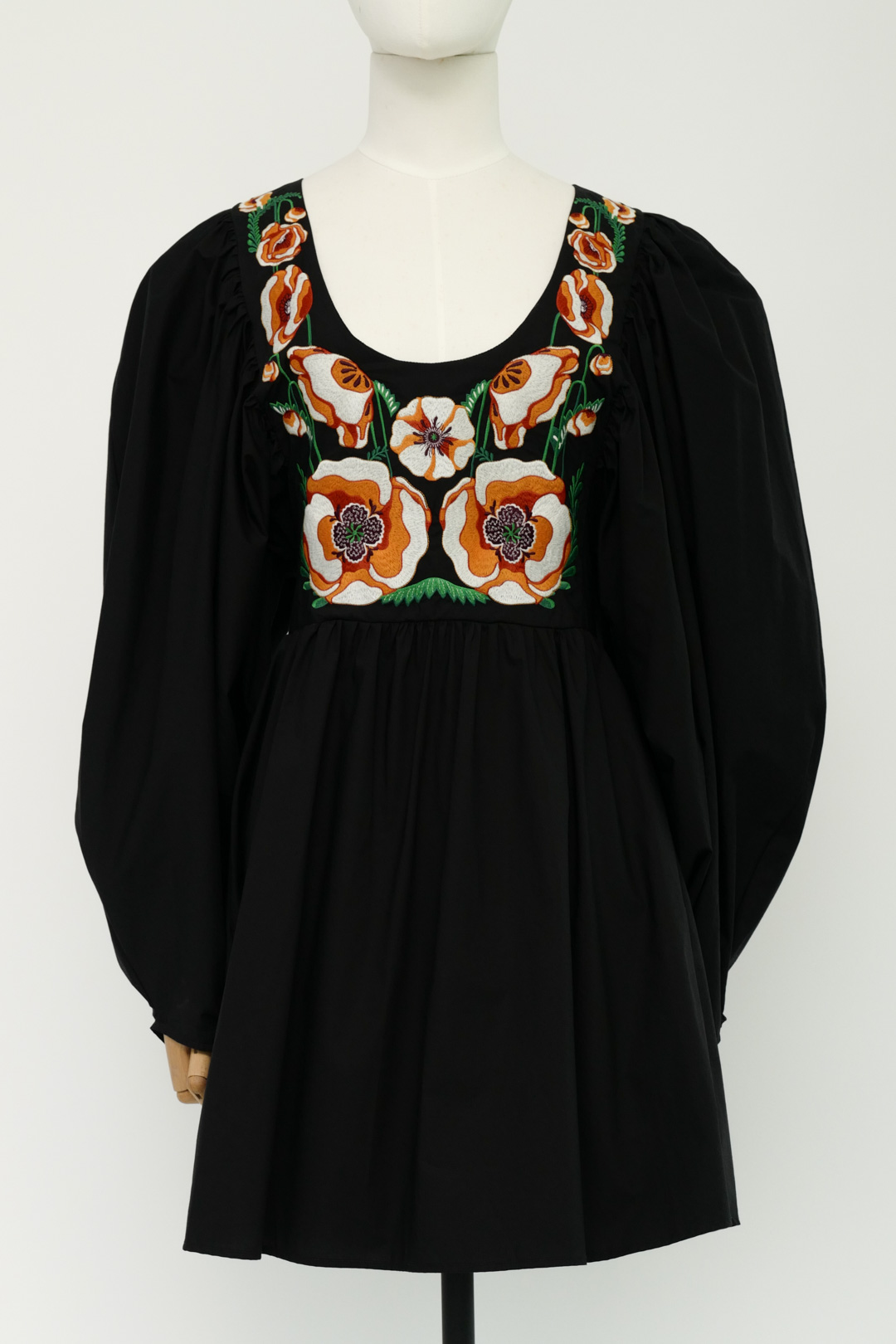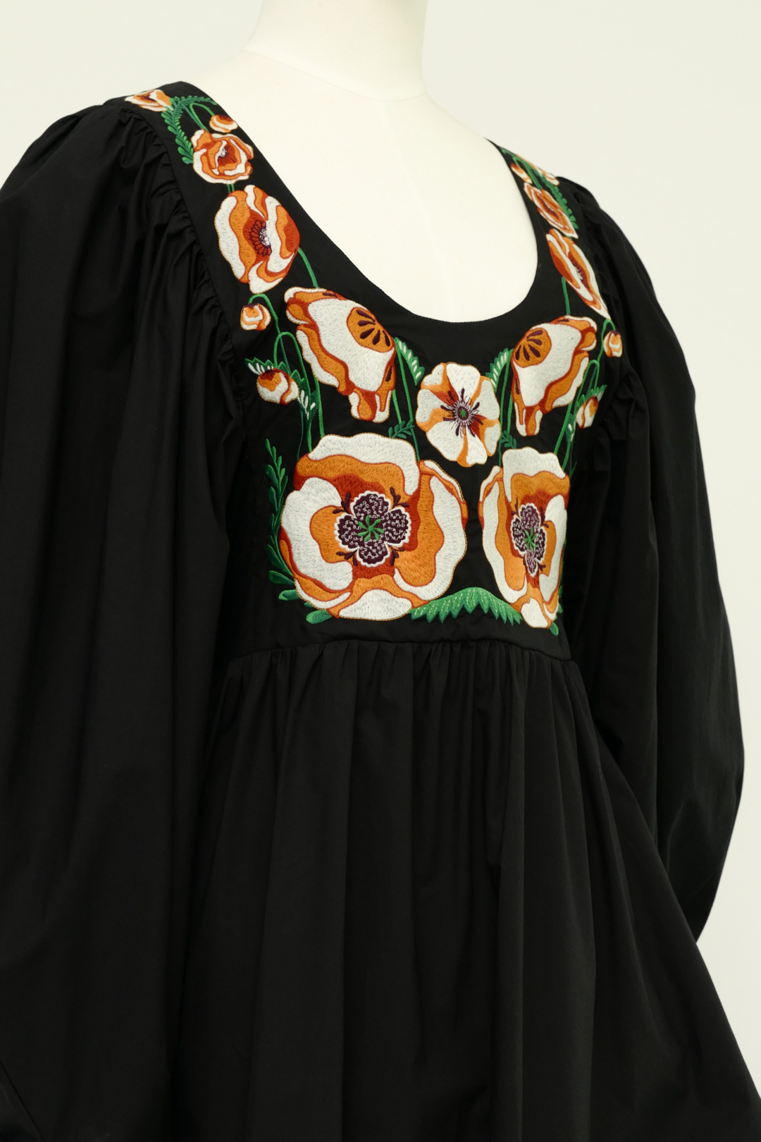 Featuring folk-inspired voluminous sleeves, this mini dress by La DoubleJ is decorated with floral placée embroidery in the shape of poppies, showcasing the label's bohemian style.