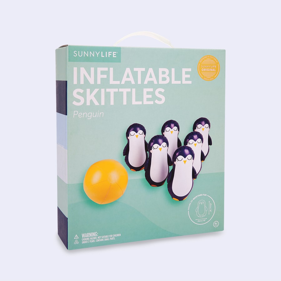 Includes 6 skittles, 1 inflatable ball, and repair patch