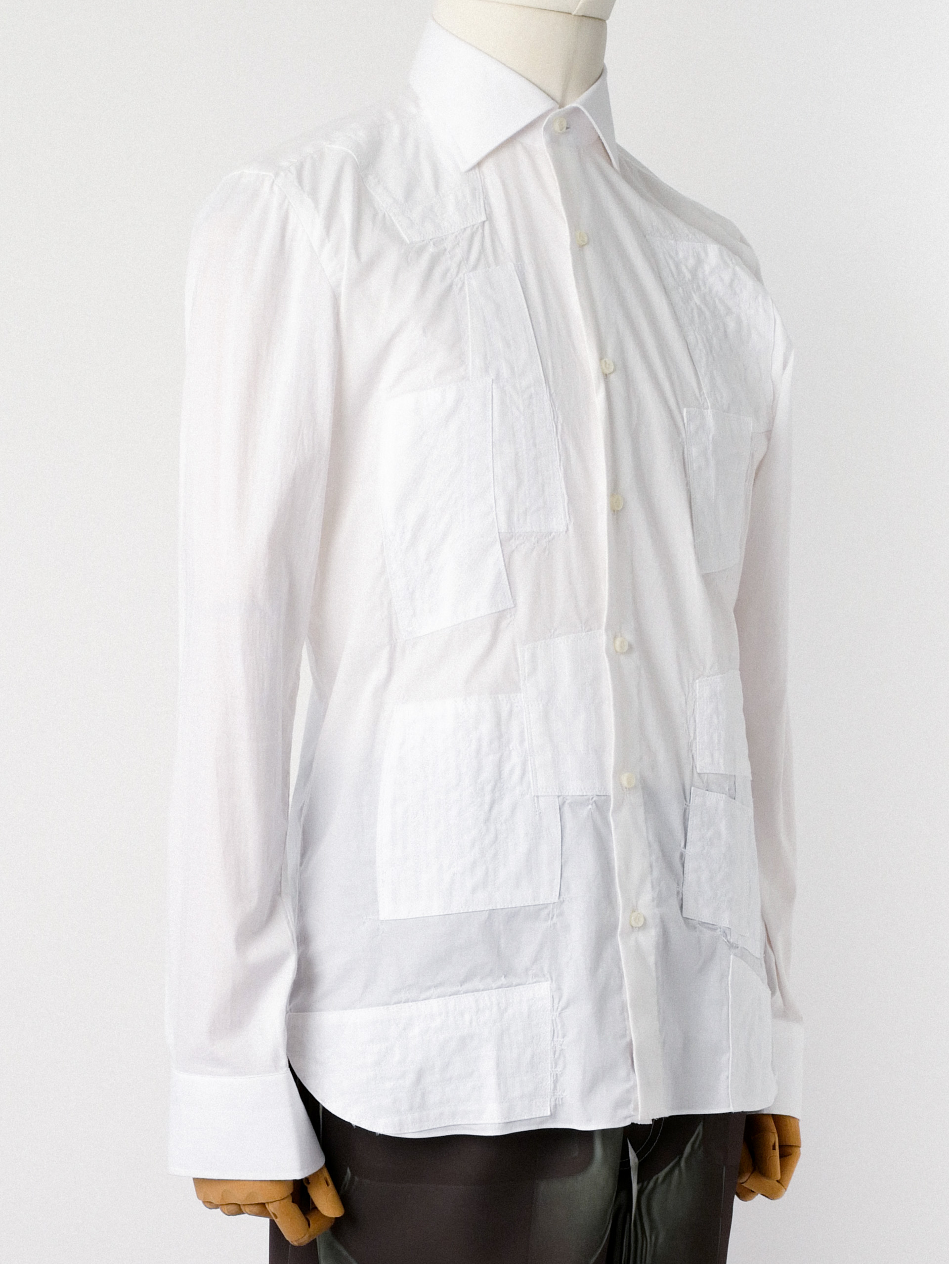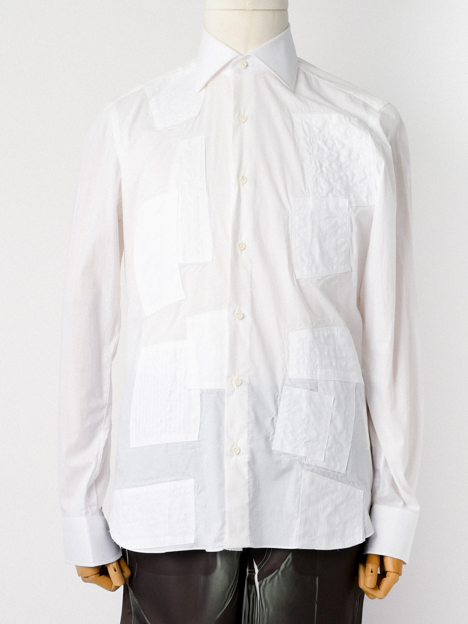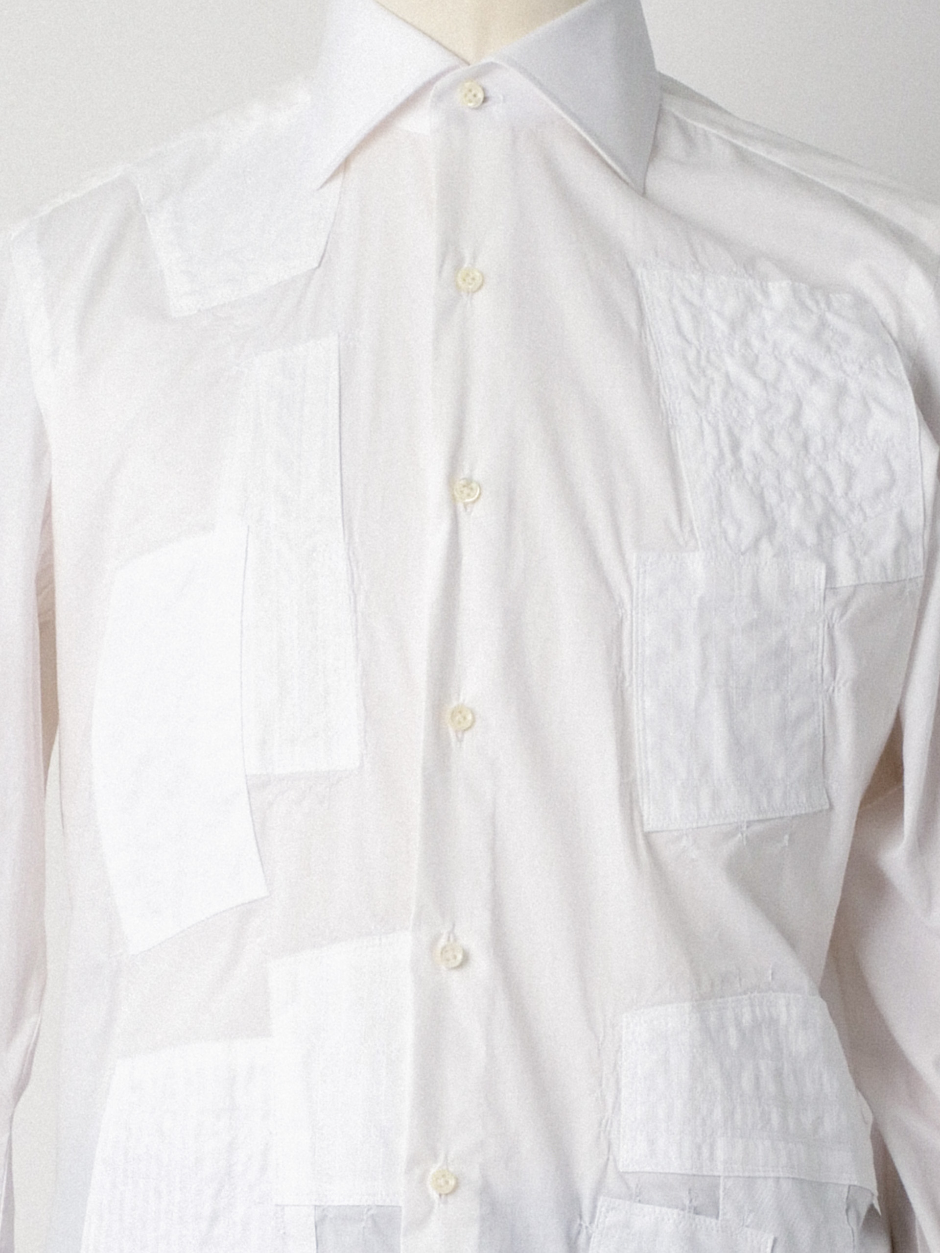 Junya Watanabe white cotton poplin shirt featuring runway-inspired front mended patches, classic collar, and dropped shoulders.