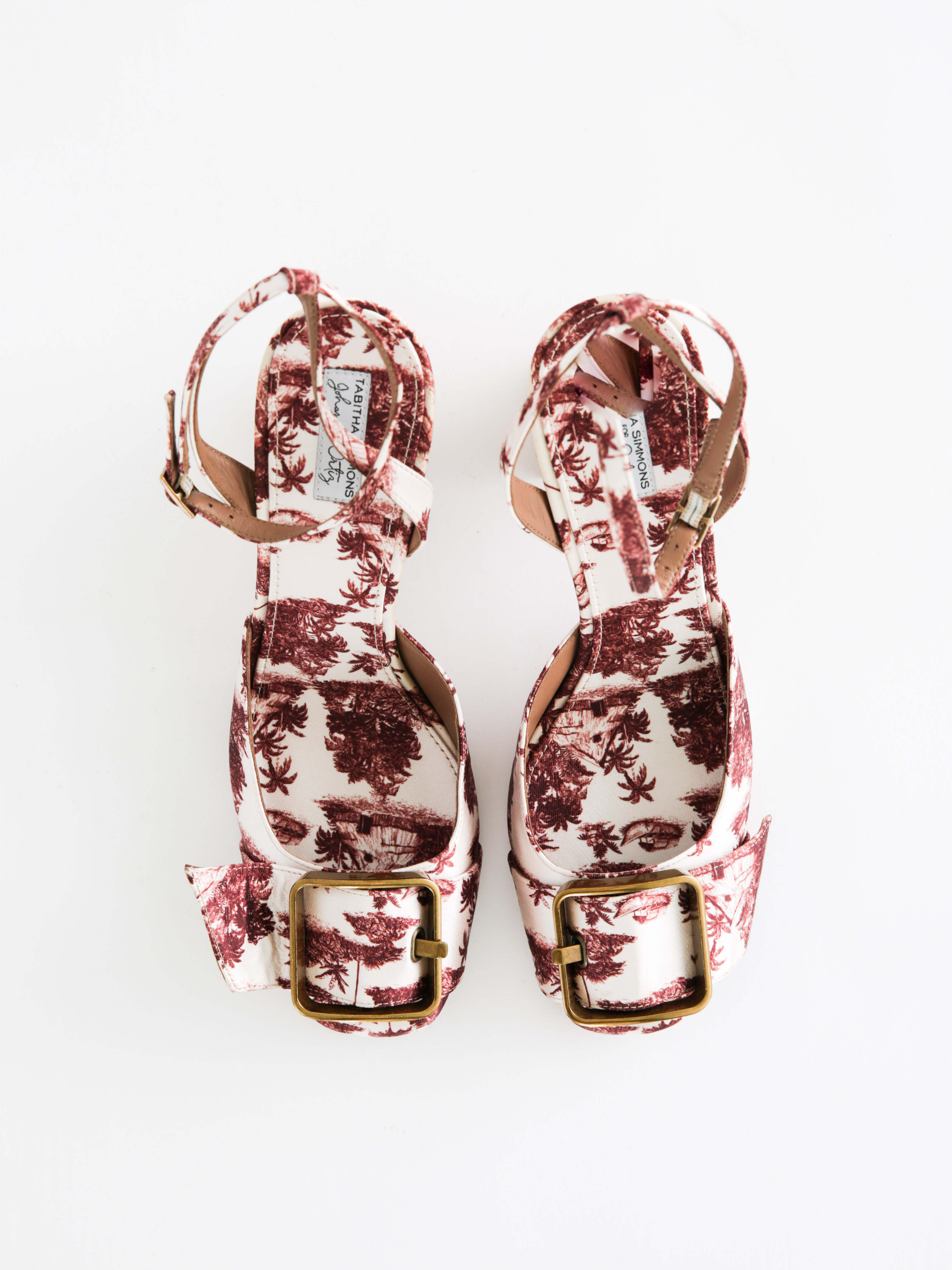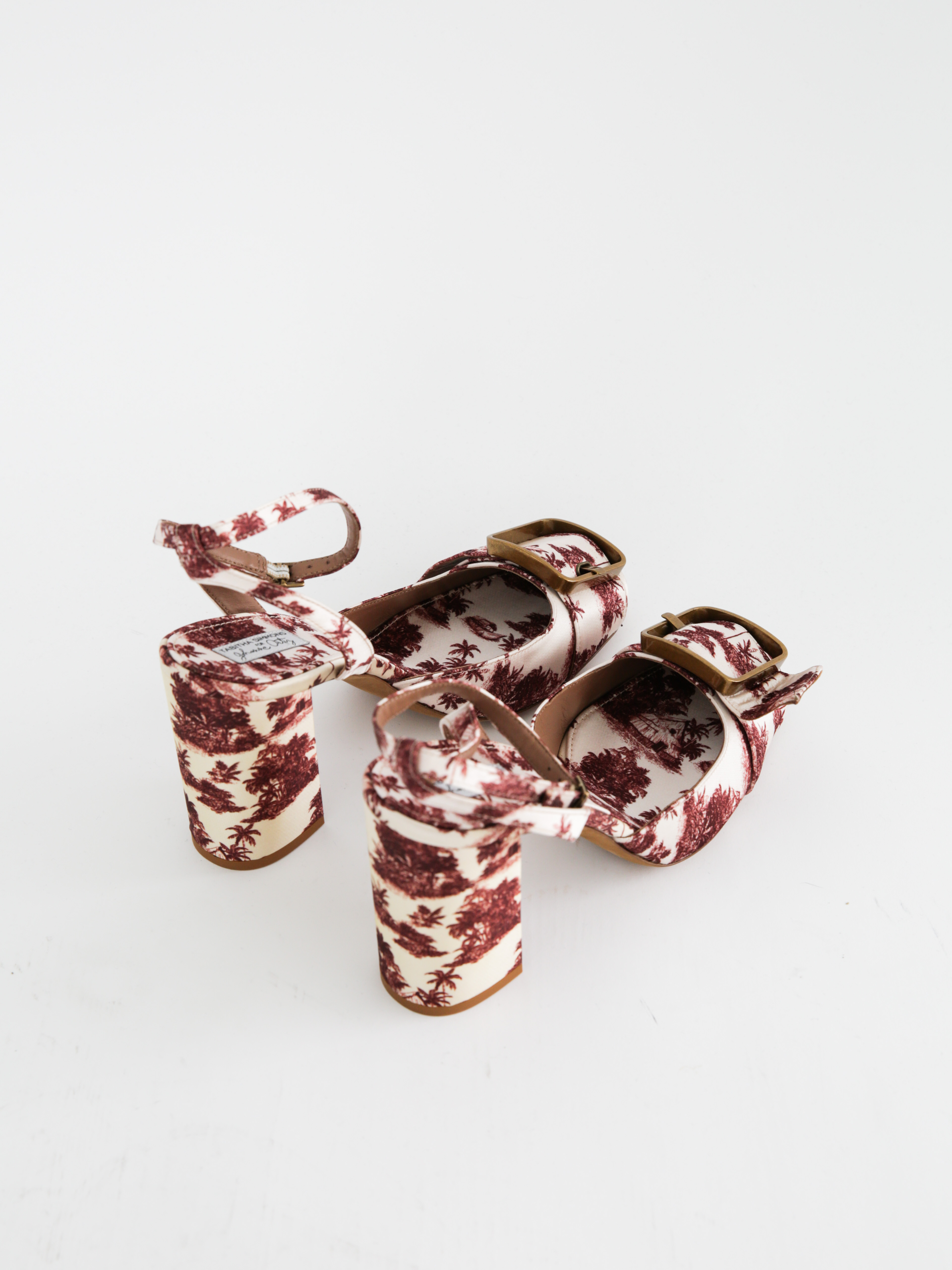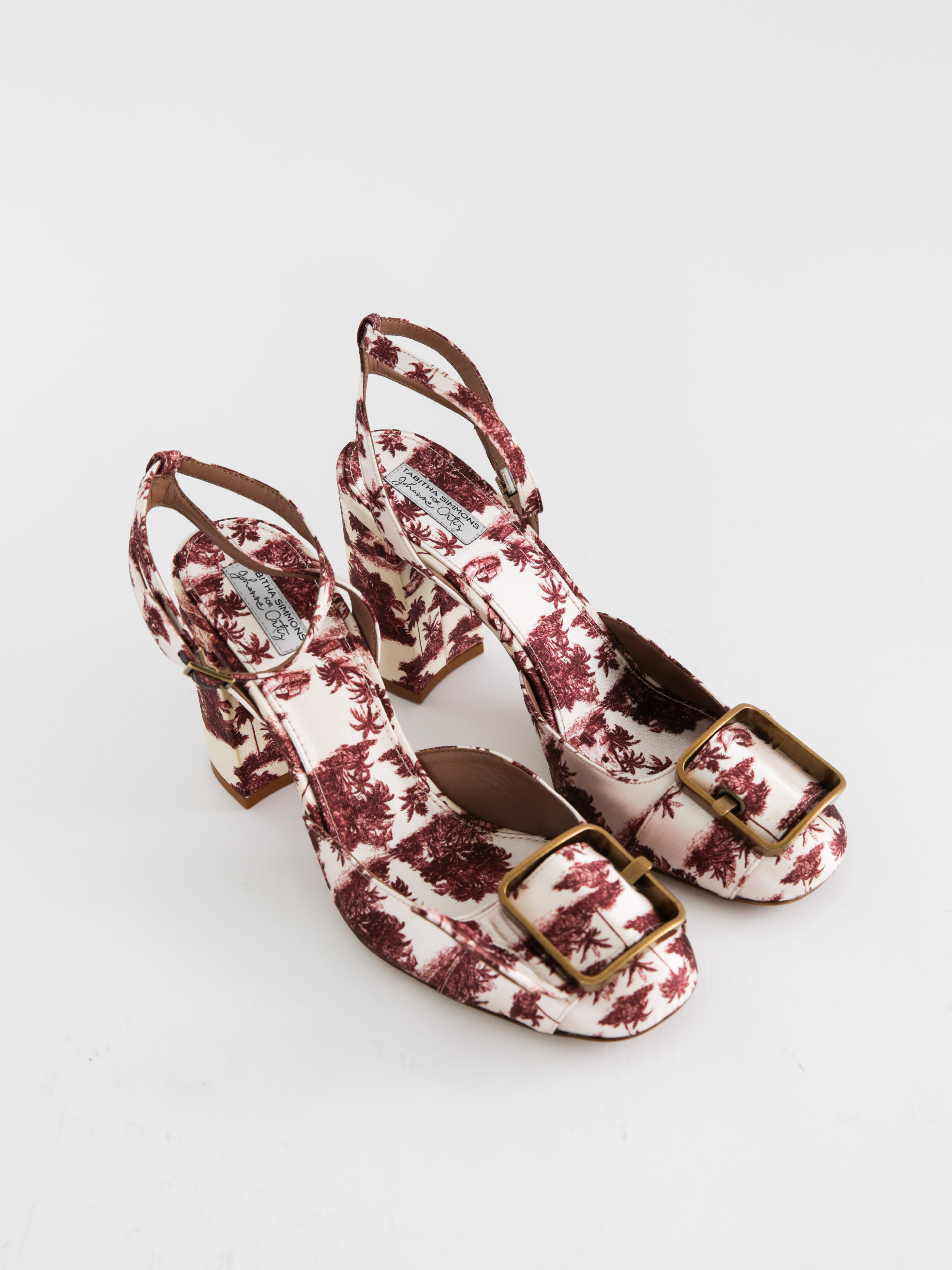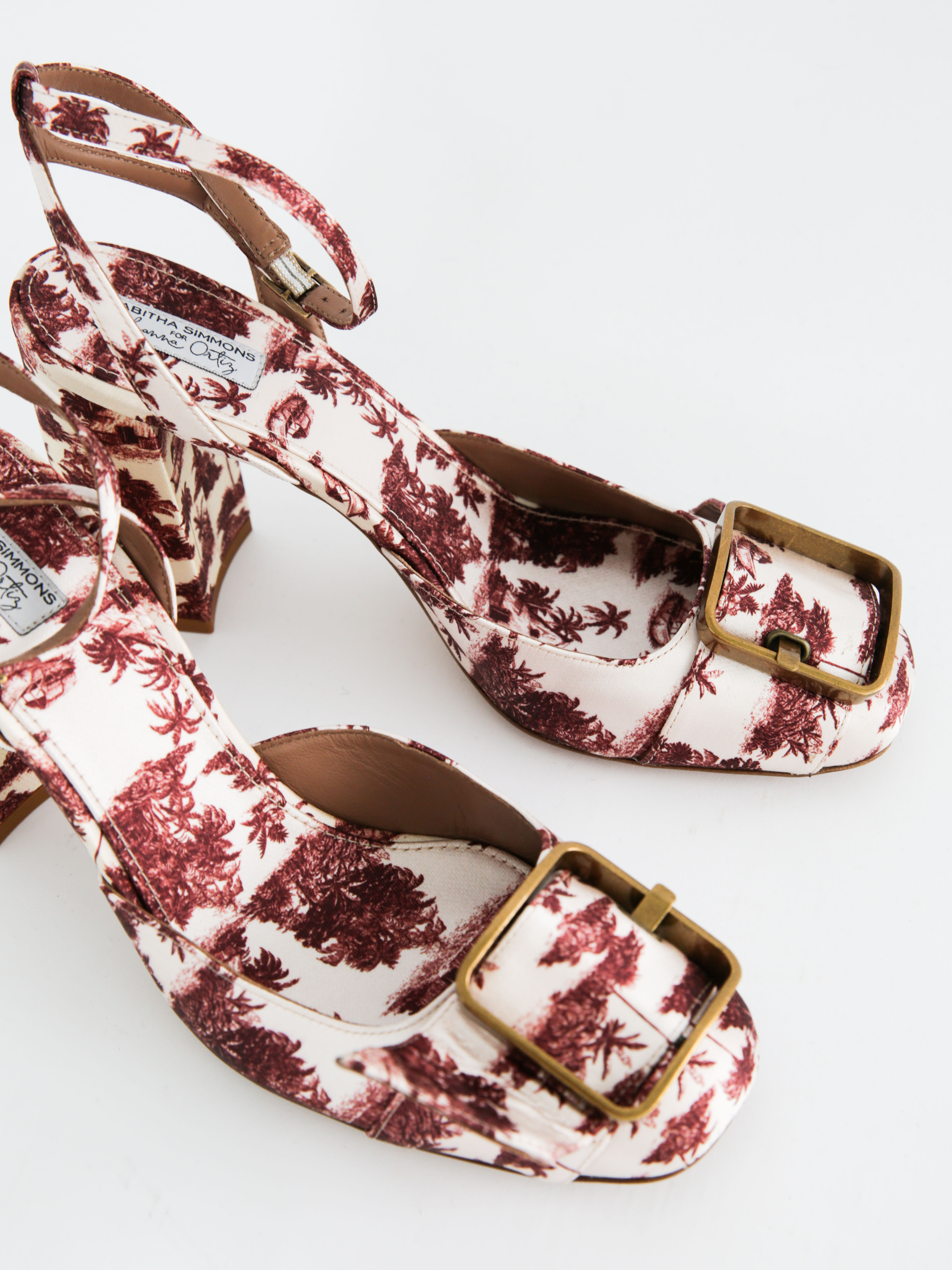Tabitha Simmons x Johana Ortiz "Serena" satin pumps in burgundy are crafted with a printed motif and a buckle embellishment. Including a block heel and an ankle buckle.