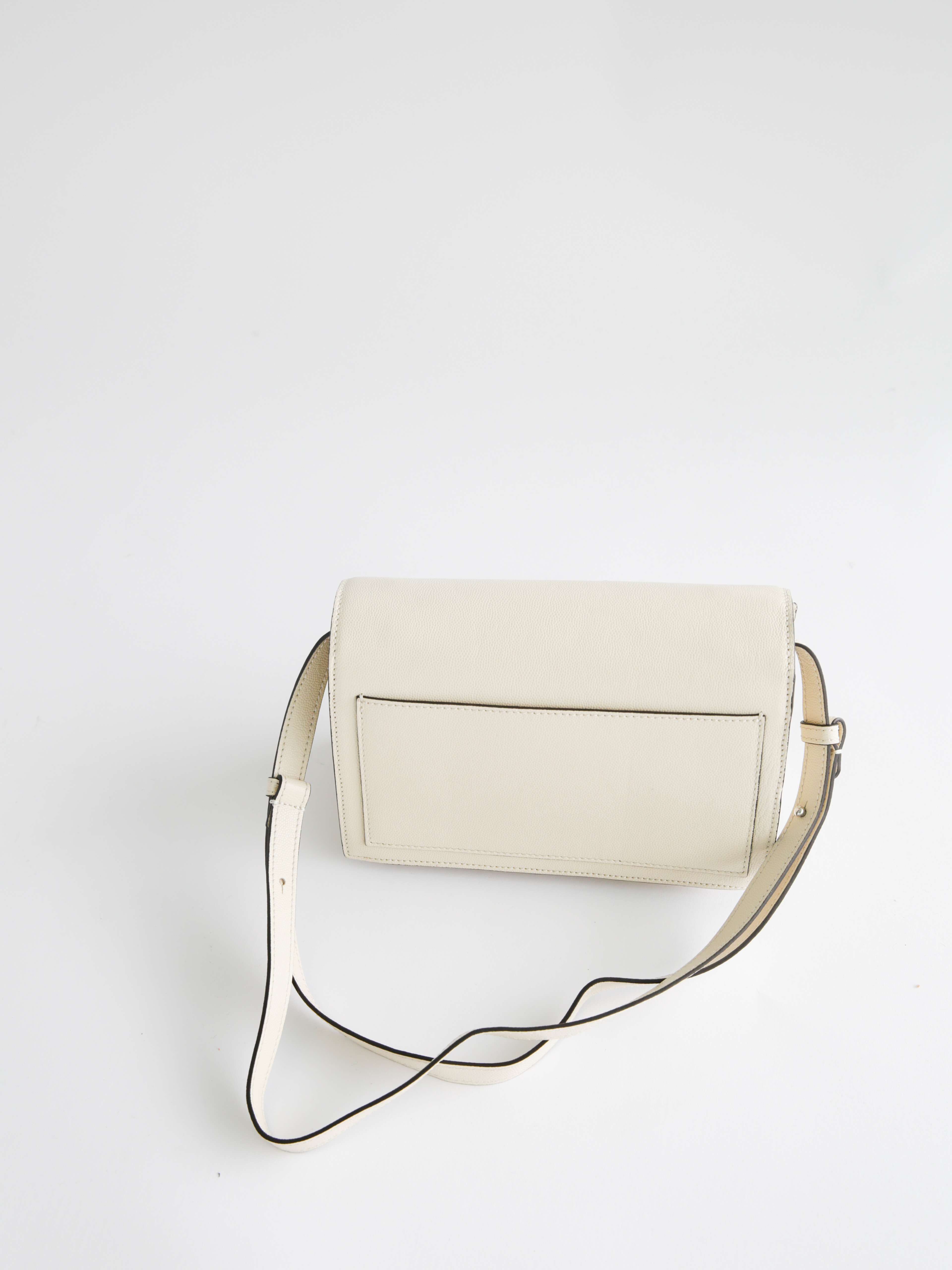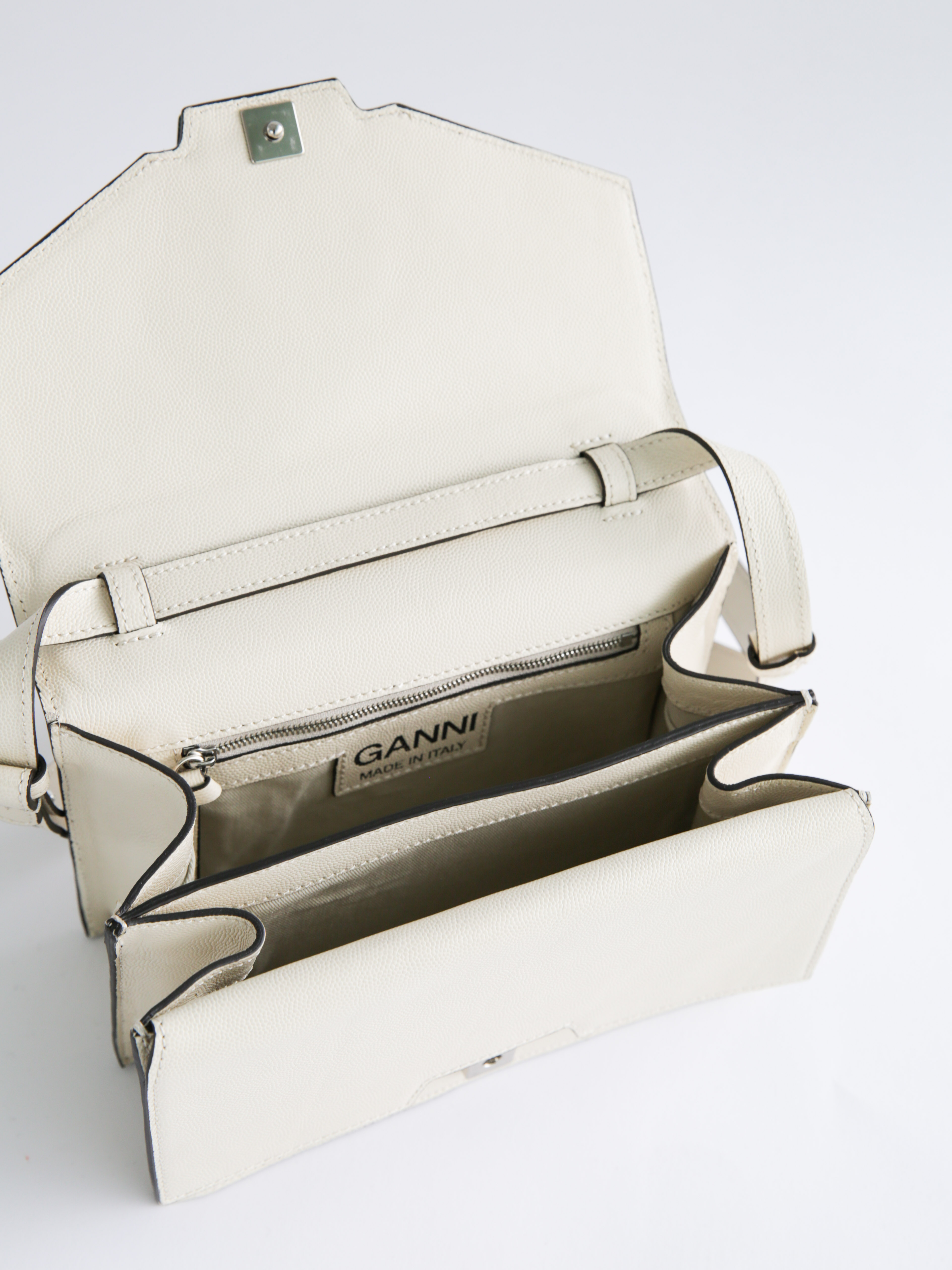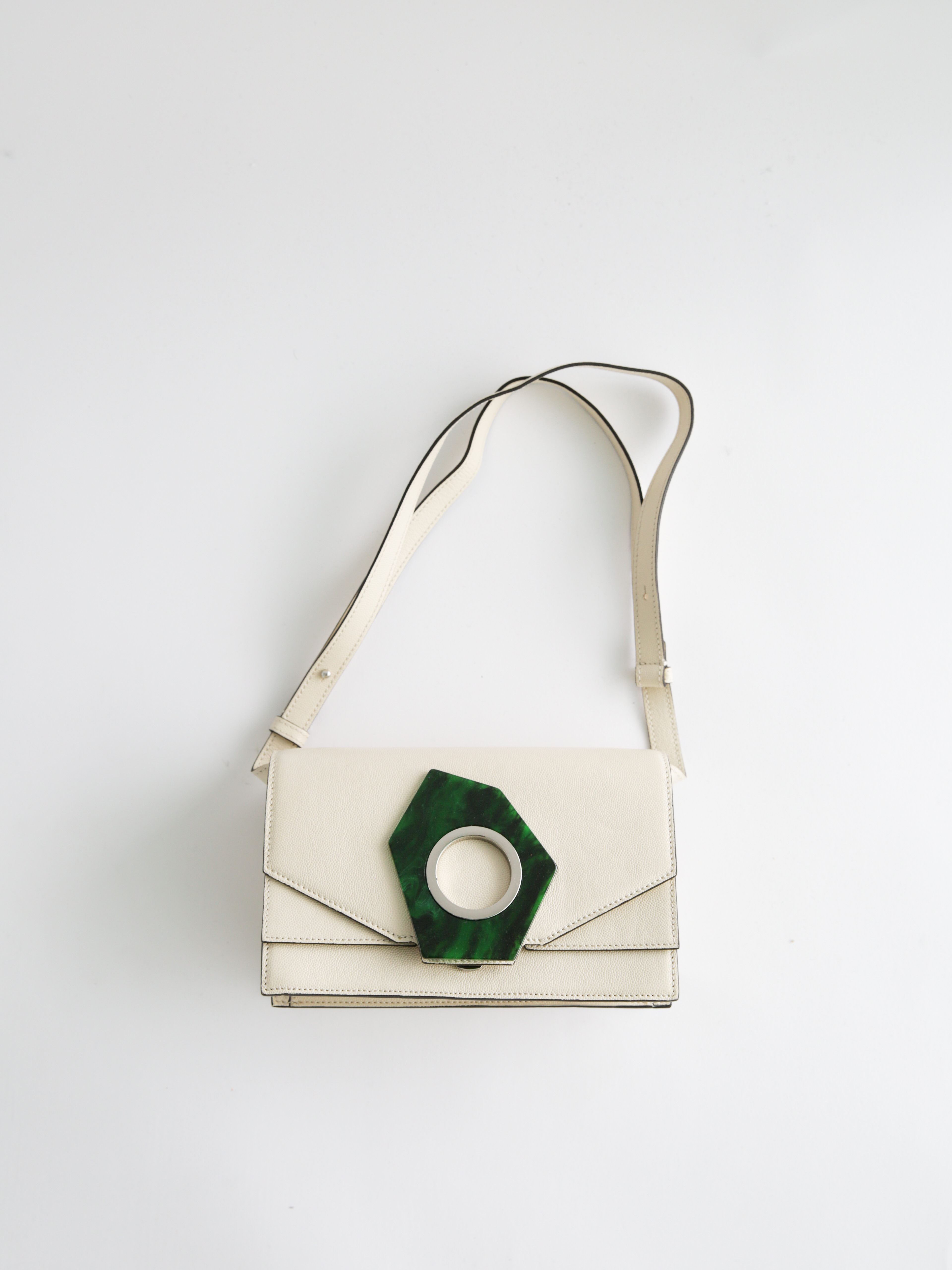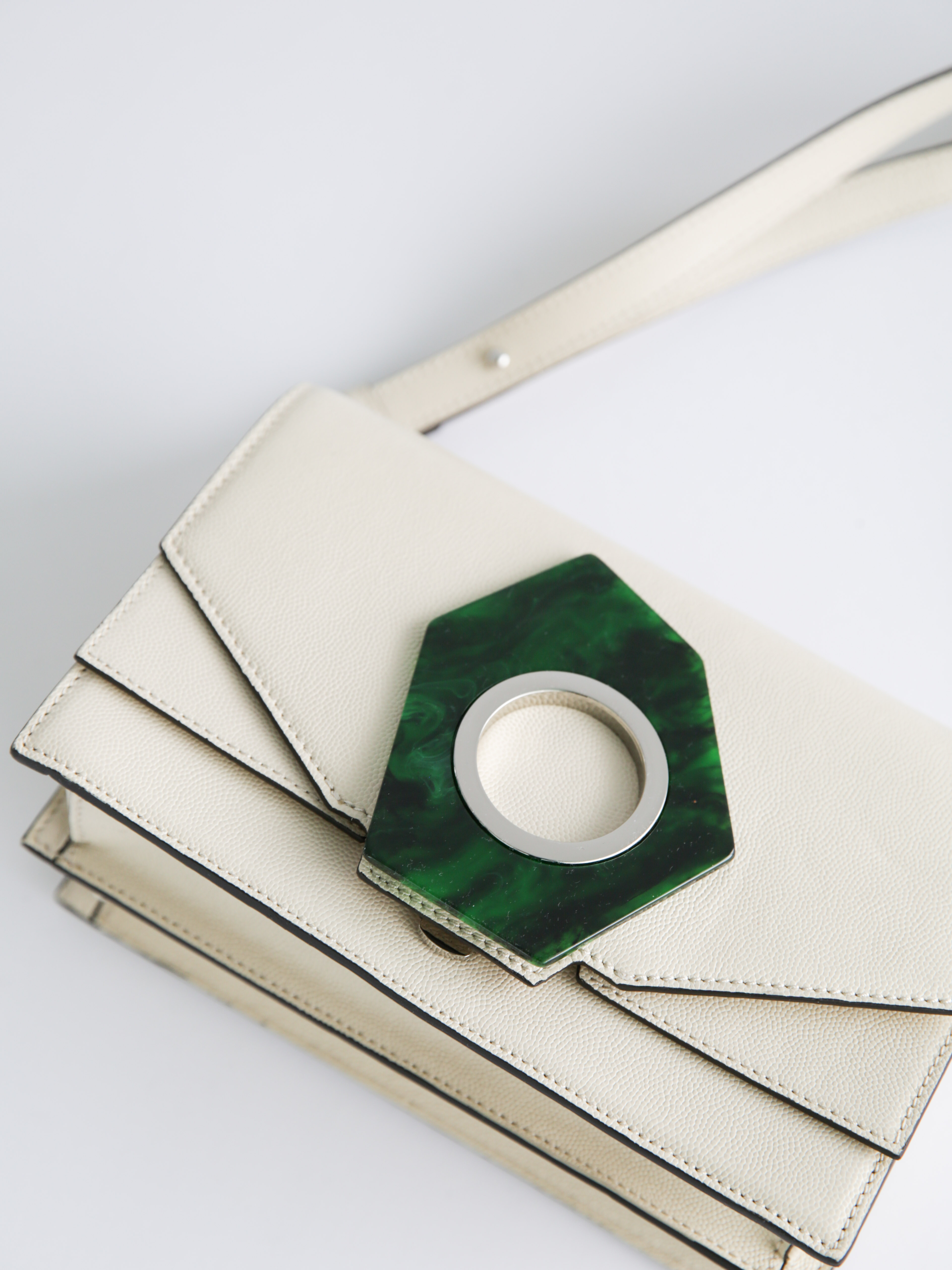 White resin embellished leather crossbody bag with an asymmetrical jade plaque from GANNI.