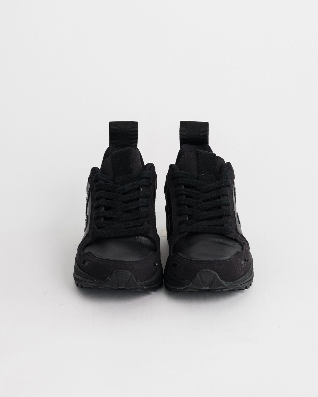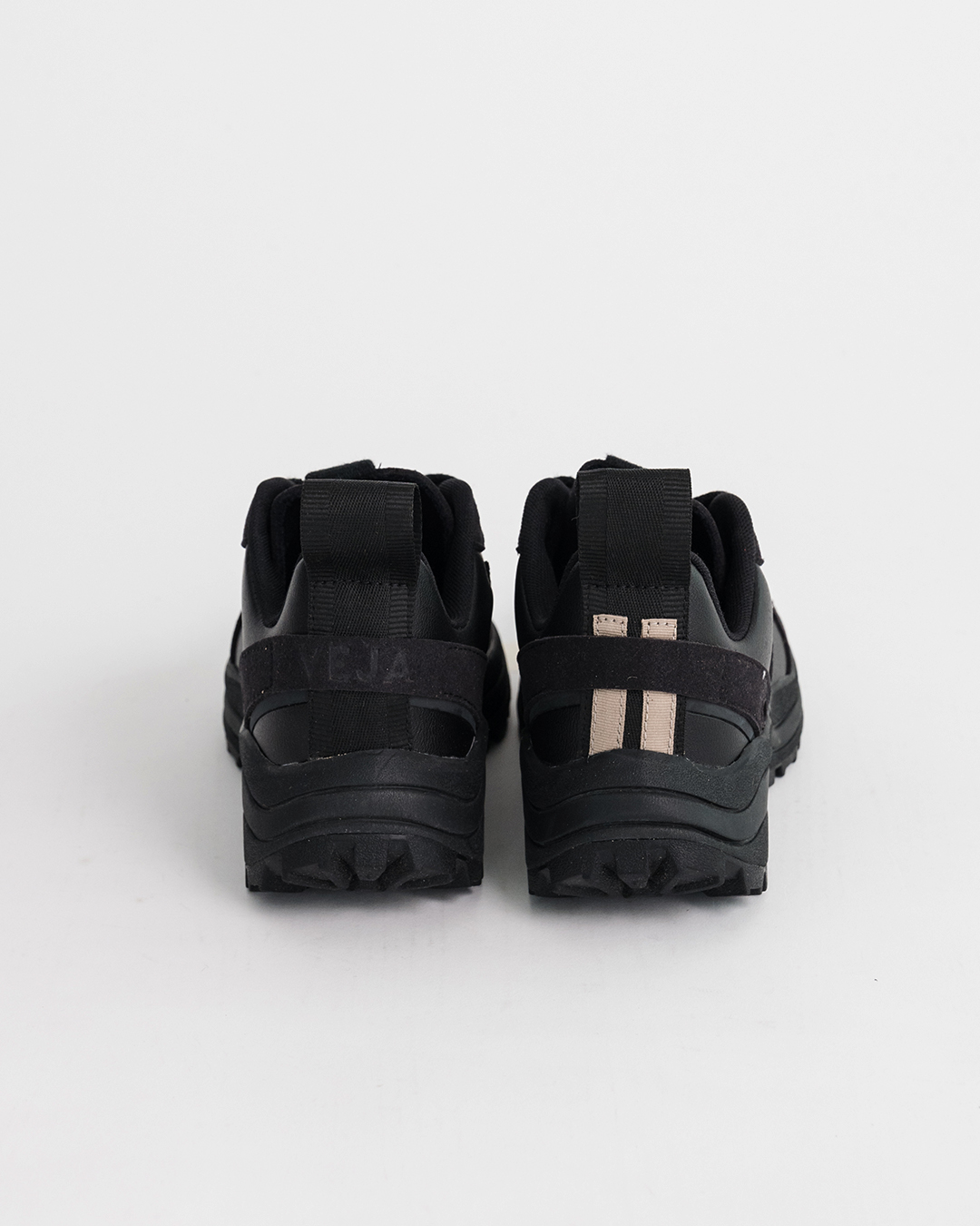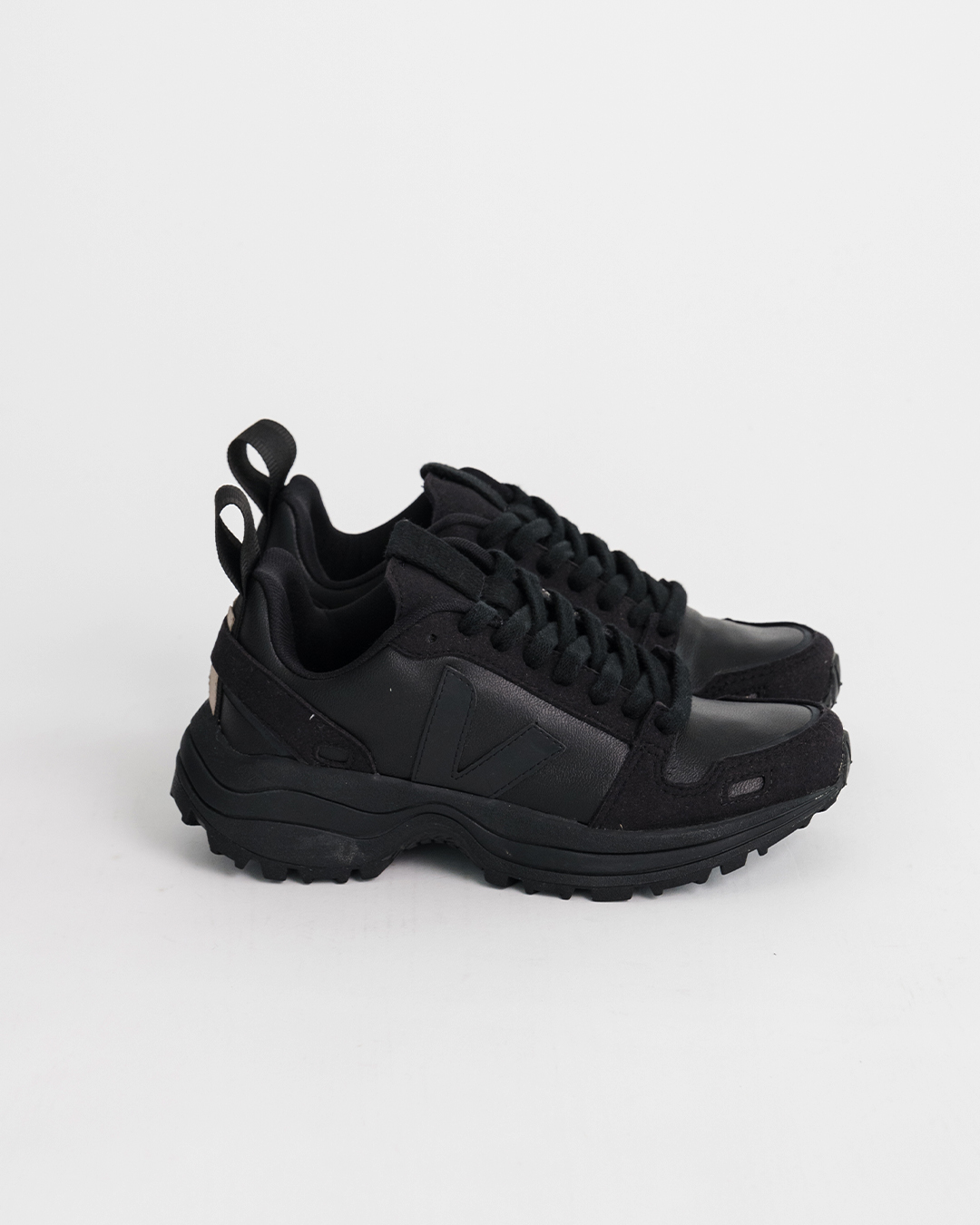 VEJA and Rick Owens reinterpret the vegan Hiking Style sneaker. This full black model stands out from the Runner Style thanks to its thicker look and adapts to any type of court. The inspirations of each brand can be found on the back of the sneaker with the double ribbon and logo. Dark grey laces are included.