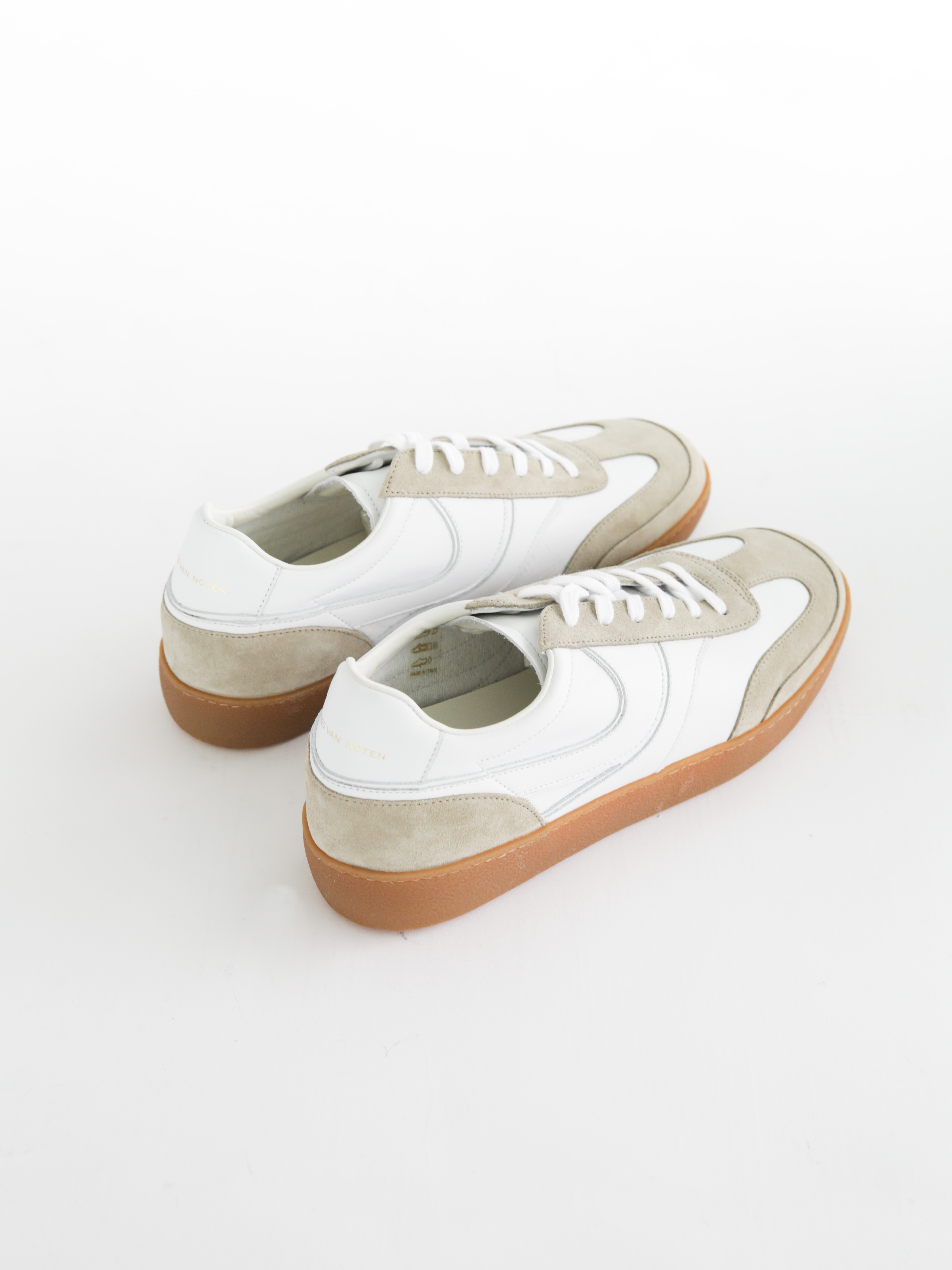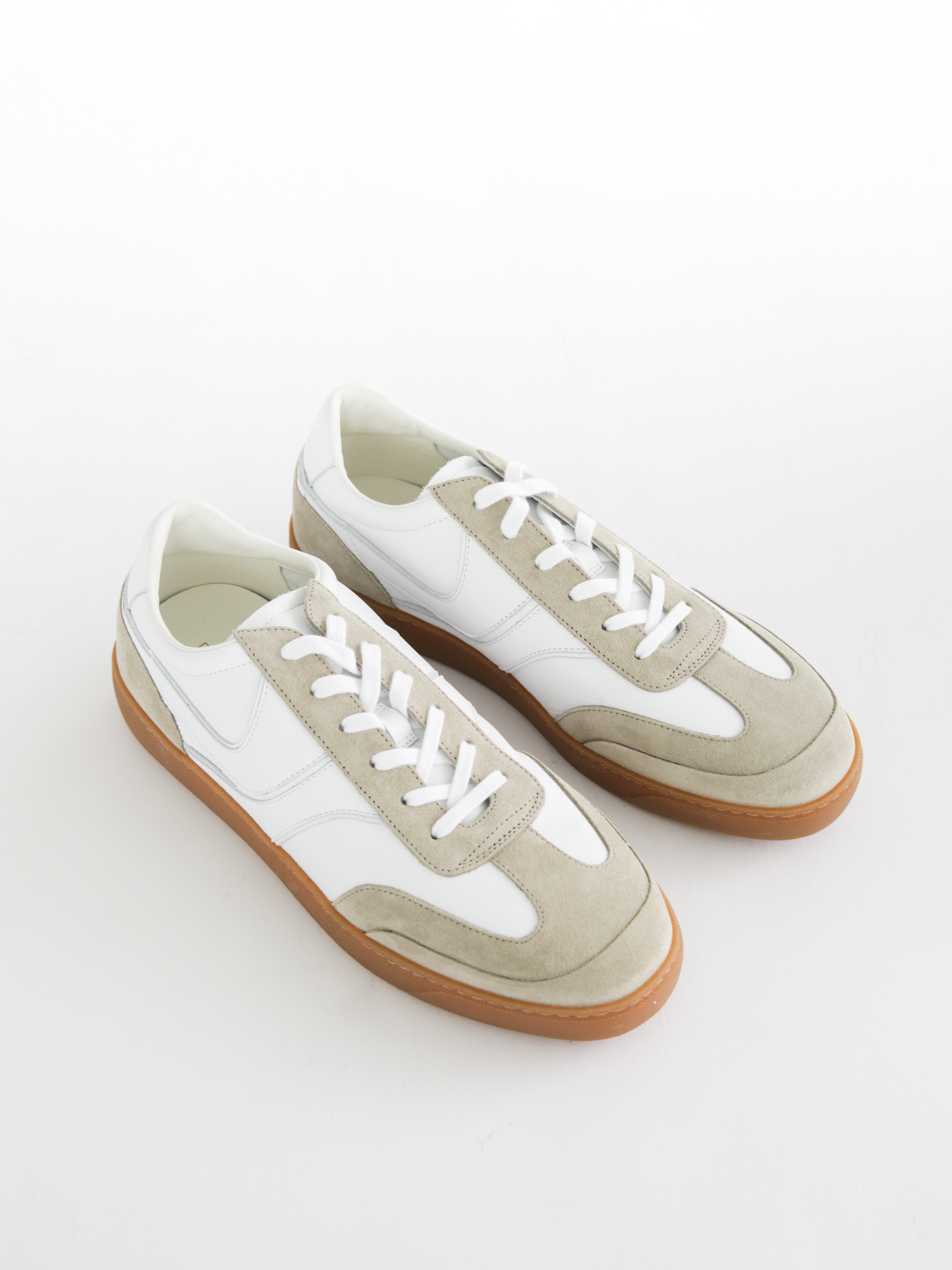 Low-top buffed leather and suede sneakers in white and beige. Round toe. Tonal lace-up closure. Padded tongue. Logo stamp in gold-tone at heel counter. Foam rubber midsole featuring stripe in black and white. Treaded rubber outsole in tan.